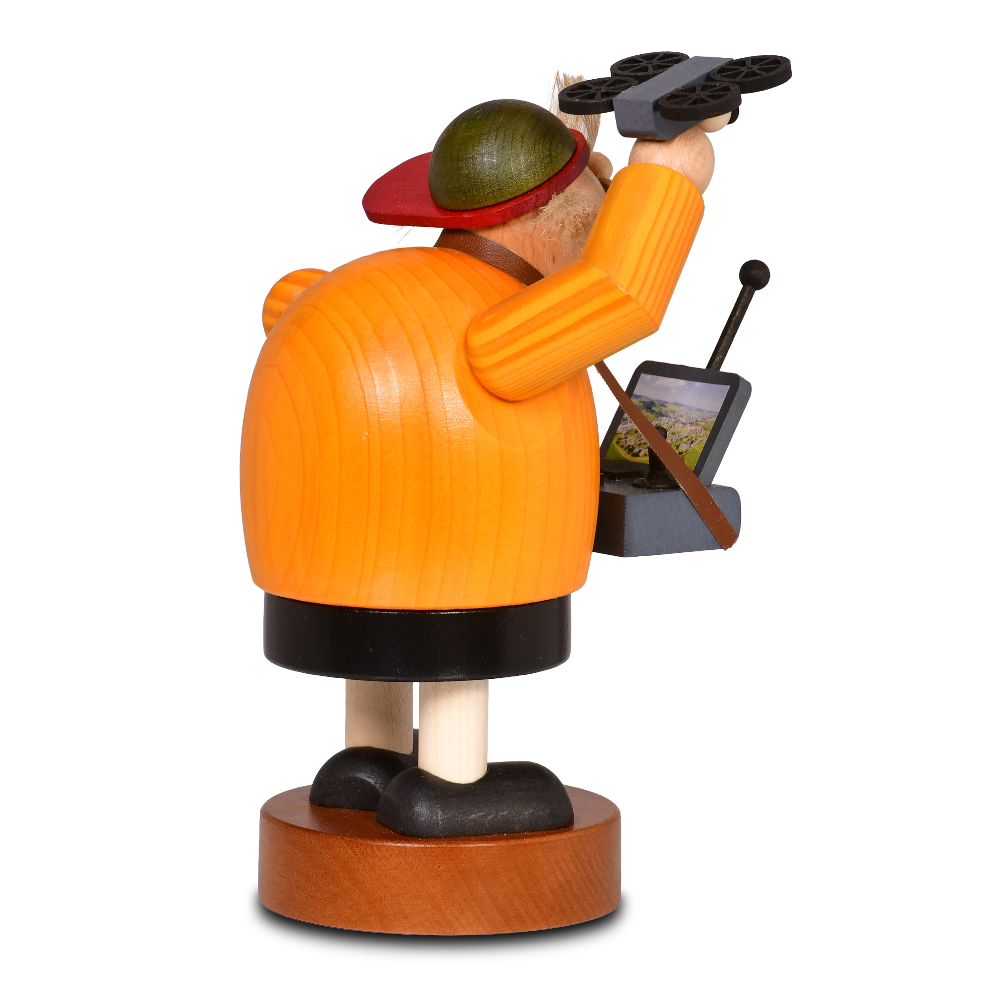Bekleidet ist die Figur mit einer leuchtend orangefarbenen Jacke und einer grün gemusterten Weste. Auf dem Kopf trägt der Drohnenflieger eine grüne Kappe mit rotem Rand, unter der sein strubbeliges Haar hervorblitzt. In der einen Hand hält er eine Fernsteuerung, während er mit der anderen Hand seine Drohne über sich in die Luft hebt – ein charmantes Detail, das diese Räucherfigur besonders macht. Eine kleine Pfeife im Mund rundet das Gesamtbild ab.