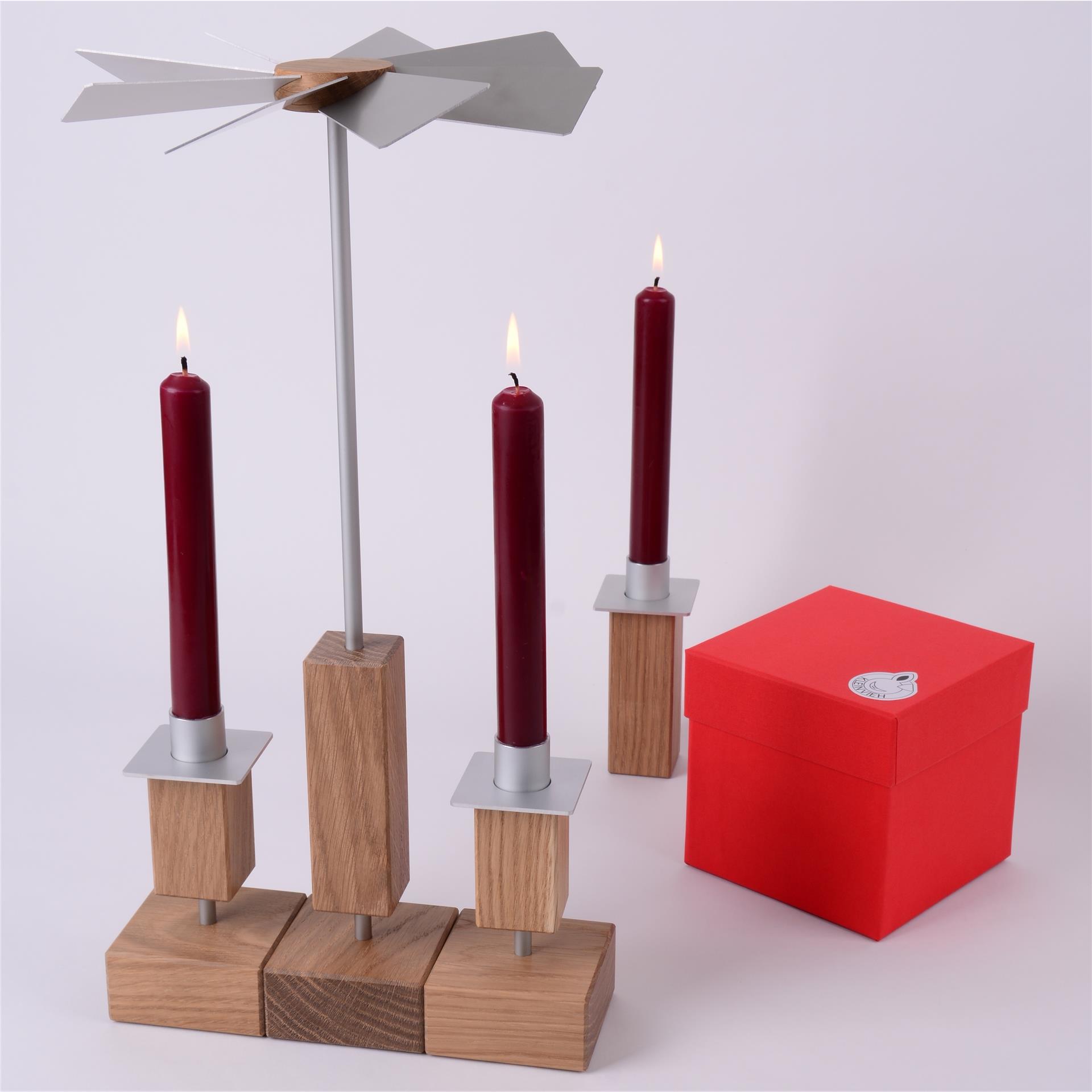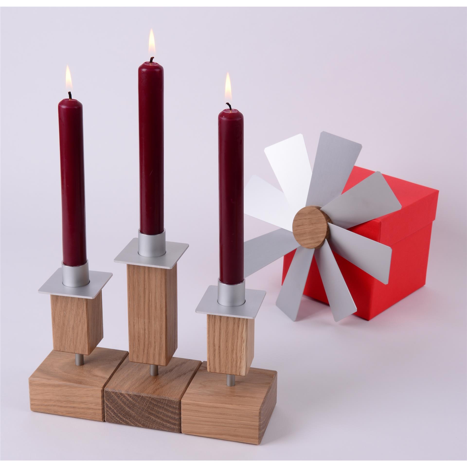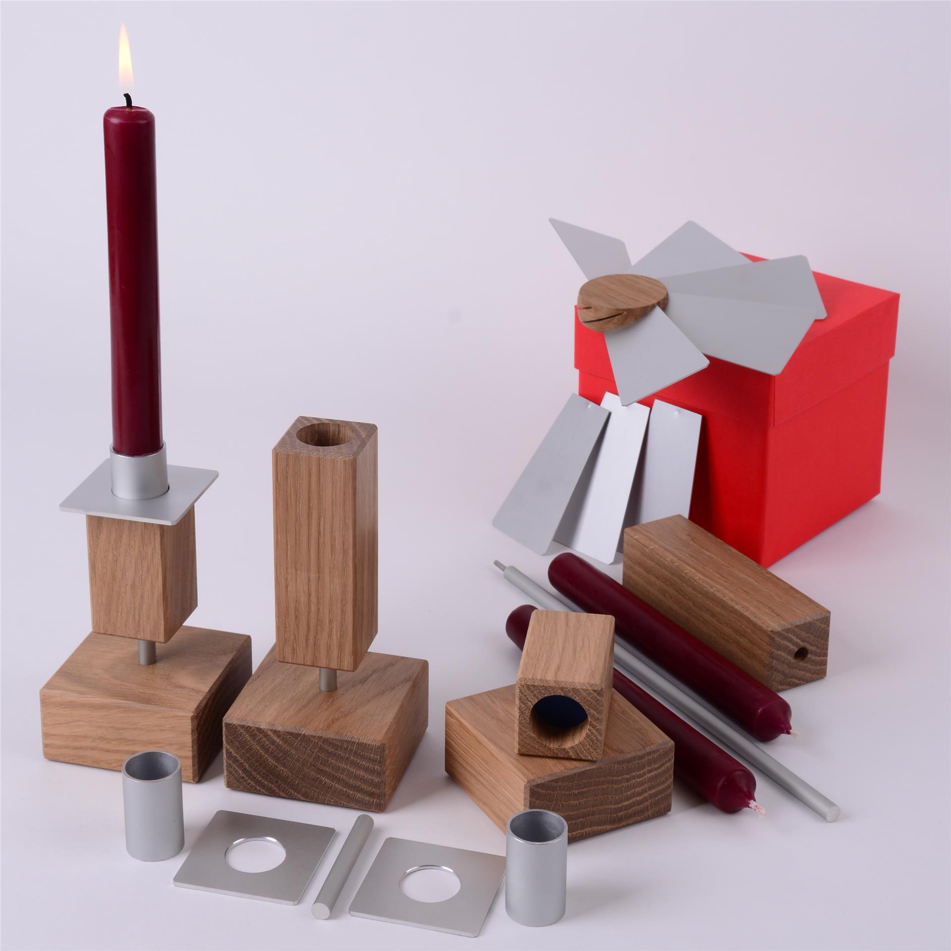 Der LEUCHTERBAUKASTEN Mini wird in Sachsen aus Eichenholz (geölt) und Aluminium-Elementen gefertigt.