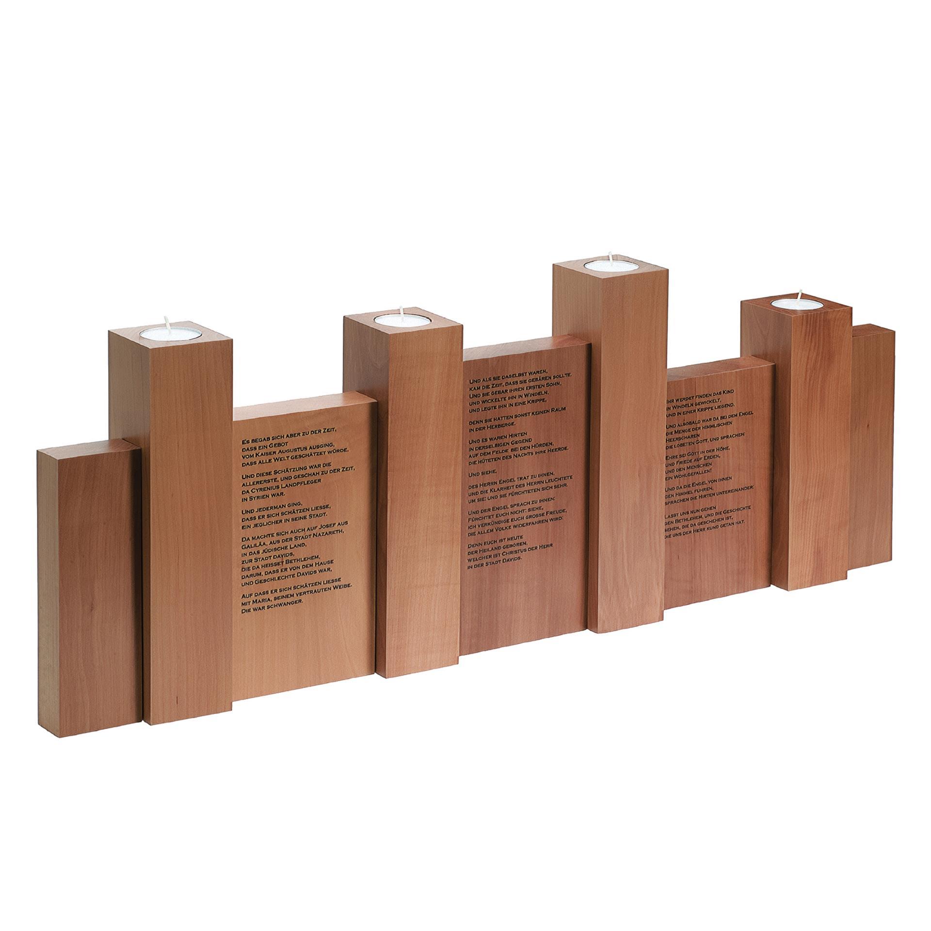 Auf drei Holzkuben ist die Weihnachtsgeschichte aus dem Neuen Testament Lucas II gedruckt. Vier Kerzenständer symbolisieren die vier Adventsonntage. Diese Elemente können wie dargestellt als »Schriftwand« oder auch als geschlossener Ring, einen Adventkranz assoziierend, aufgestellt werden. Da die Abmessungen der Kuben und Schriftblöcke denen der Systemmaße der Weihnachtskrippen Rebecca und Rahel entsprechen, läßt sich Lucas sehr gut in die Krippenlandschaft integrieren.