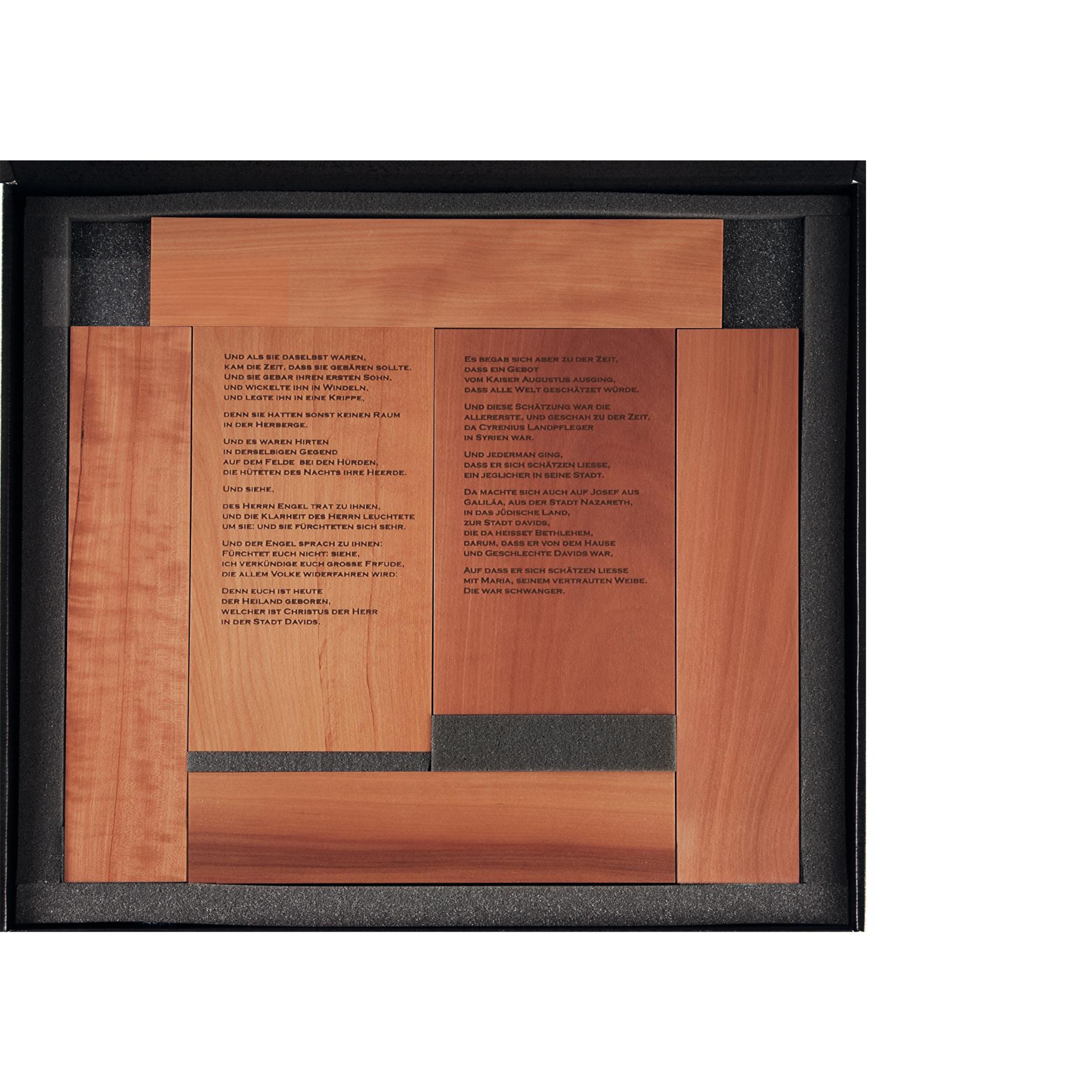 Auf drei Holzkuben ist die Weihnachtsgeschichte aus dem Neuen Testament Lucas II gedruckt. Vier Kerzenständer symbolisieren die vier Adventsonntage. Diese Elemente können wie dargestellt als »Schriftwand« oder auch als geschlossener Ring, einen Adventkranz assoziierend, aufgestellt werden. Da die Abmessungen der Kuben und Schriftblöcke denen der Systemmaße der Weihnachtskrippen Rebecca und Rahel entsprechen, läßt sich Lucas sehr gut in die Krippenlandschaft integrieren.