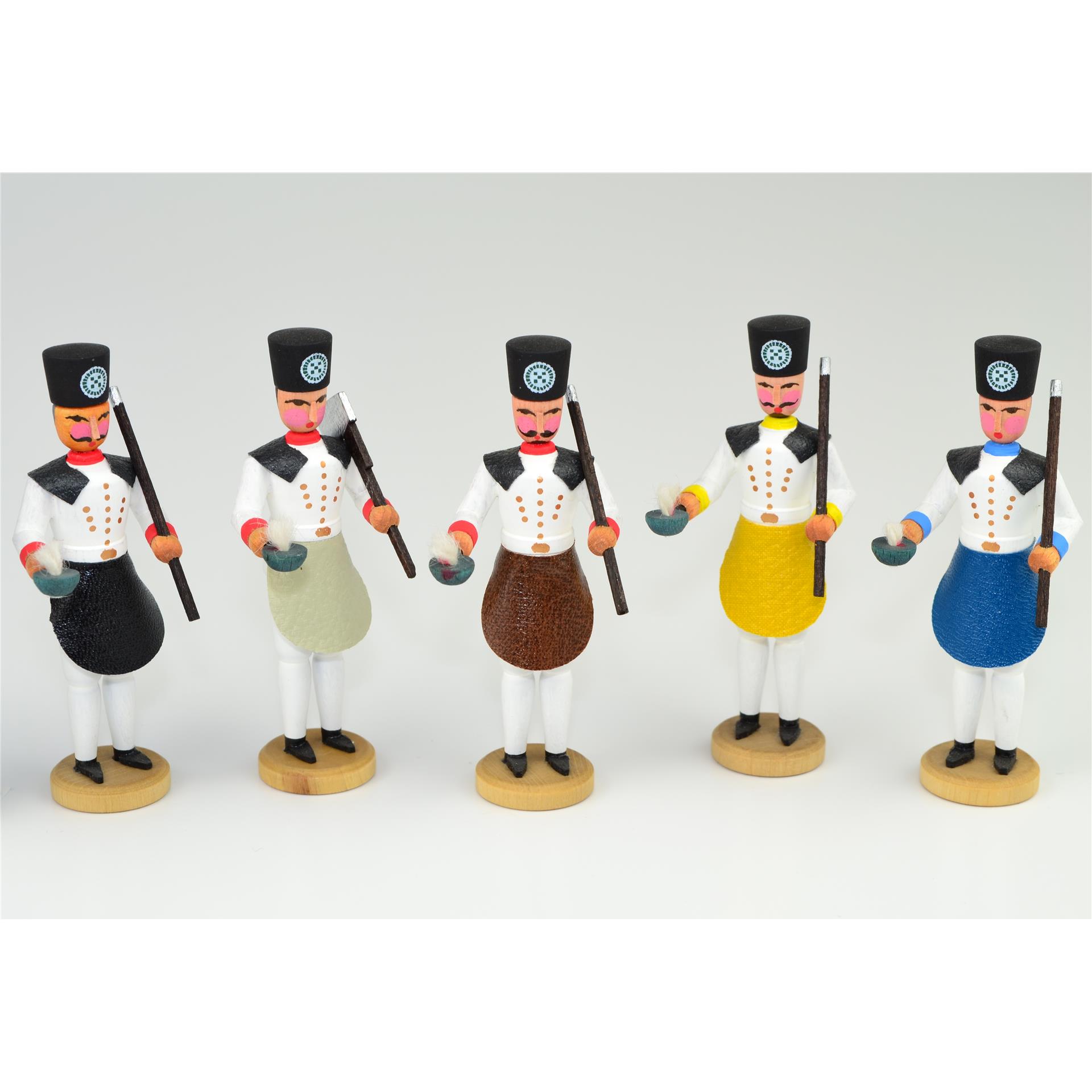 Zur Figurengruppe der Hüttenleute, die an ihren Öfen aus dem gewonnenen Erz das wertvolle Metall schmolzen, zählen Oberhüttenverwalter, Akademist, Schüler, Hüttenmann, Amalgamierer, Saigerhüttenarbeiter (braune Schürze), Schwefelhüttenarbeiter (gelbe Schürze) und der Blaufarbenarbeiter (blaue Schürze).