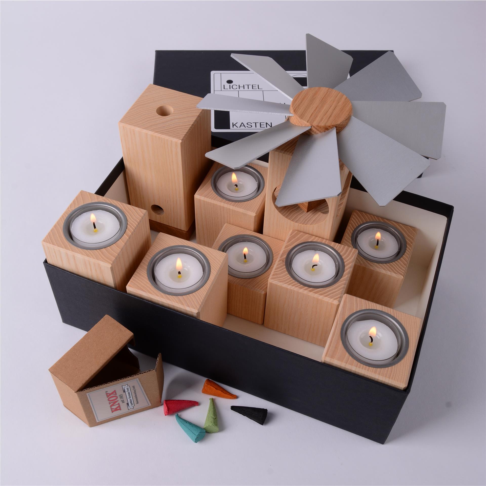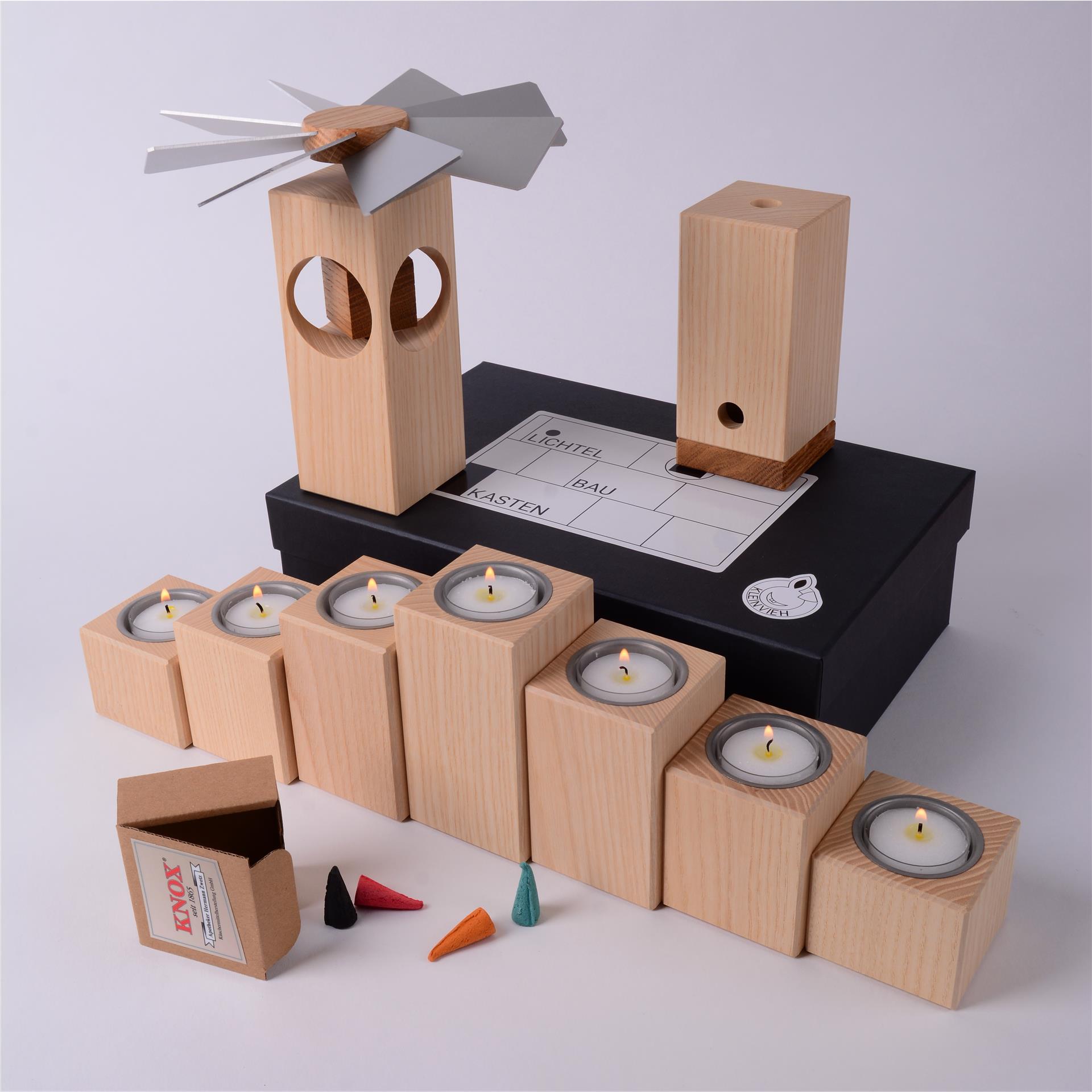 KLEINVIEH - Lichtelbaukasten mit Weihnachtspyramide & "Räucherdings" - Esche natur