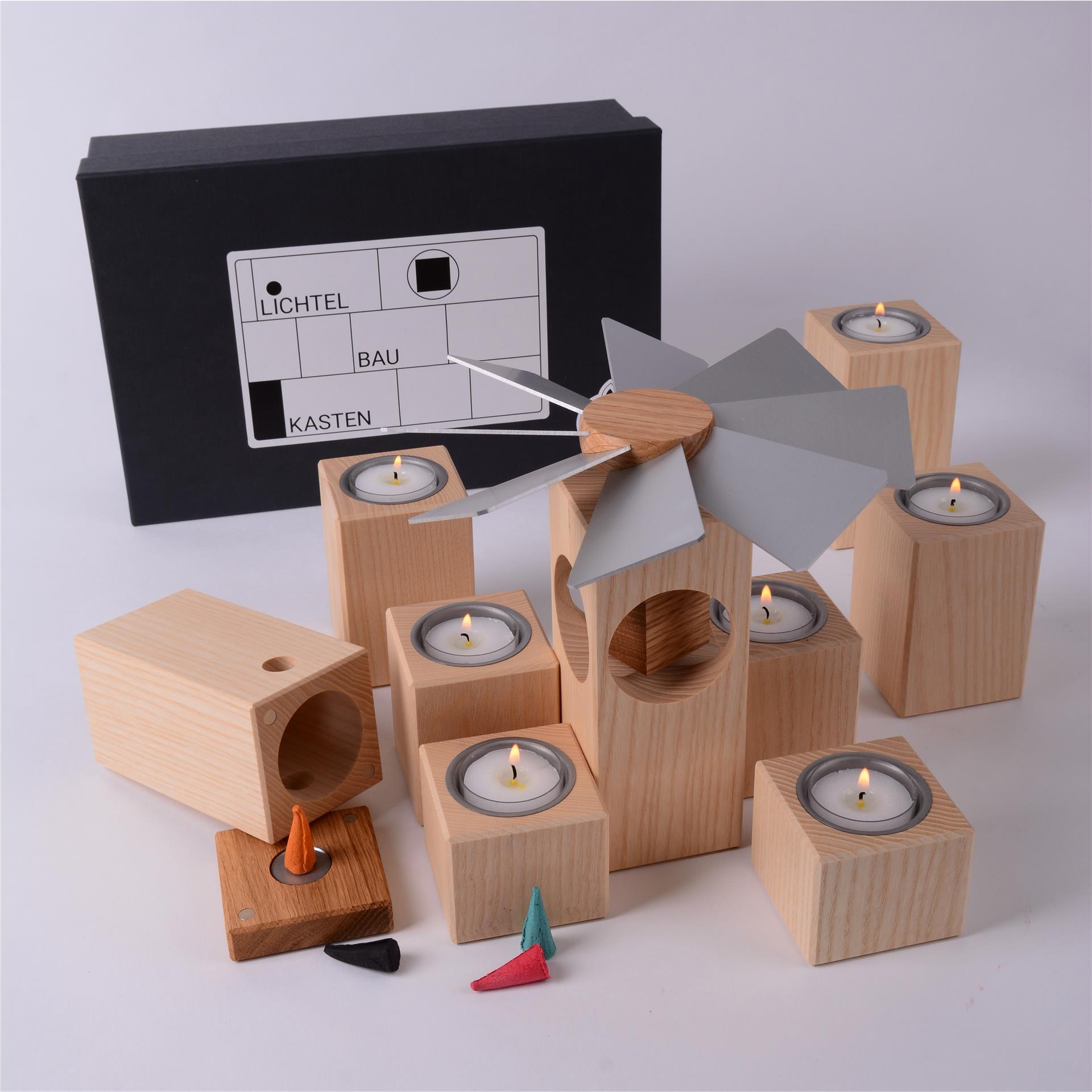 Das ist der LICHTELBAUKASTEN: Neun Elemente aus Eschenholz, die sich in vielen Varianten aufbauen lassen und die sofort die richtige Weihnachtsstimmung verbreiten.