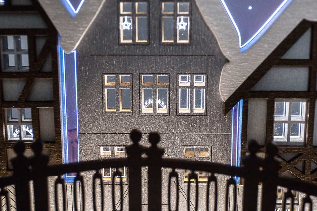 Der moderne LED Lichterbogen "Winter in der Altstadt" besteht aus bläulich und weiß scheinenden flourescent Plexiglas, welches eine glänzend glatte Oberfläche und eine hohe Transparenz mit einem leuchtenden, farbinensiven Kanteneffekt, durch die Lasergravur, garantiert. Der Schwibbogen wird mit lasergravierten Sperrholz und in Teilen dunkelbraun, weiß und grau gestaltet, um einen sehr schönen 3D-Effekt zu erzielen. Der Holzsockel besteht aus Buche und ist ebenfalls farblich abgestimmt. In ihm befindet sich der energiesparende LED-Strip, der die Lampe zum Leuchten bringt. Durch die separat montierten Holzelemtente entsteht mit der LED-Beleuchtung ein indirektes Licht, welches den Lichterbogen in verschiedene Schatteneffekte taucht.